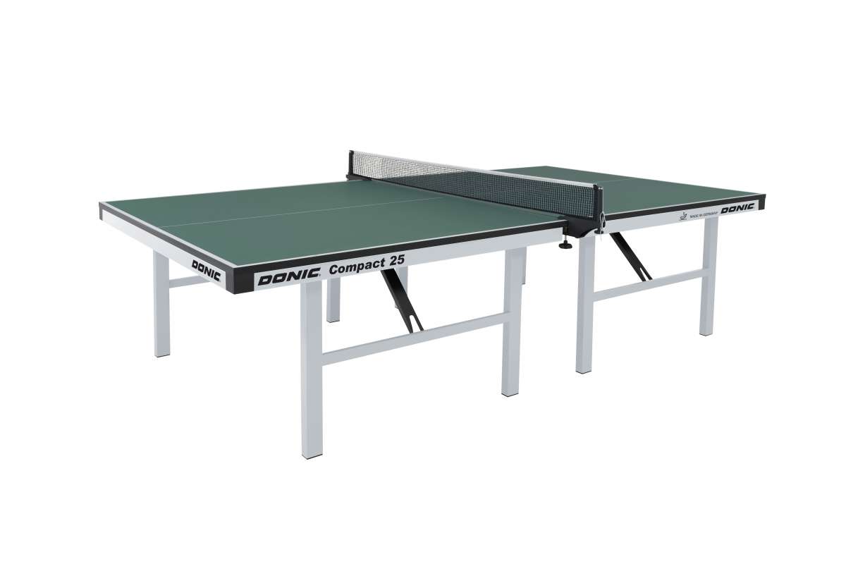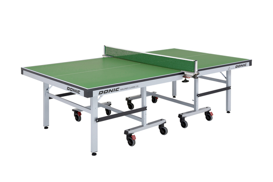 Der neue konventionelle DONIC-Wettkampftisch mit 25mm Oberfläche. Der Tisch besteht aus 2 Hälften, welche in Spielposition durch Verbindungselement fixiert werden. Technische Details: - 25mm Oberfläche, grün oder blau - Randverstärkung: Stahlblech 60mm, pulverbeschichtet - Standbeine: 60x40mm - Rollen: je 2 gummierte Rollen 128mm an den Tischinnenseiten. Geringer Montageaufwand. Tisch fertig montiert bis auf die Rollen. Minimaler Stauraum: 1525x165x1420mm Gewicht: 105kg Norm: EN14468-1, Klasse A Made in Germany ITTF zugelassen Bei allen Tischbestellungen benötigen wir Ihre Telefonnummer zur Anlieferung ! Video zur Aufbauanleitung unter Materialhilfen sowie FAQ´s !